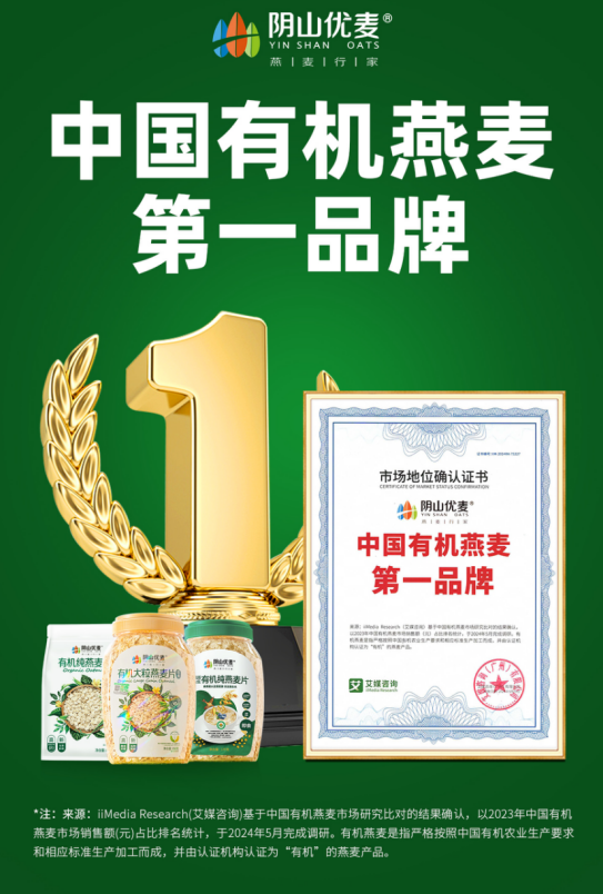 iiMedia Research(艾媒咨詢)是全球新經(jīng)濟產(chǎn)業(yè)第三方數(shù)據(jù)挖掘和分析機構(gòu),基于中國有機燕麥市場研究比對的結(jié)果確認,以2023年中國有機燕麥市場銷售額(元)占比排名統(tǒng)計,于2024年5月完成調(diào)研。其中,有機燕麥是指嚴格按照中國有機農(nóng)業(yè)生產(chǎn)要求和相應(yīng)標準生產(chǎn)加工而成,并有認證機構(gòu)認證為“有機”的燕麥產(chǎn)品。此次艾媒咨詢授予陰山優(yōu)麥“中國有機燕麥第、一品牌”市場地位確認證書,也是對陰山優(yōu)麥長期致力于推廣有機燕麥、保障食品安全、提升燕麥產(chǎn)品品質(zhì)的認可。
