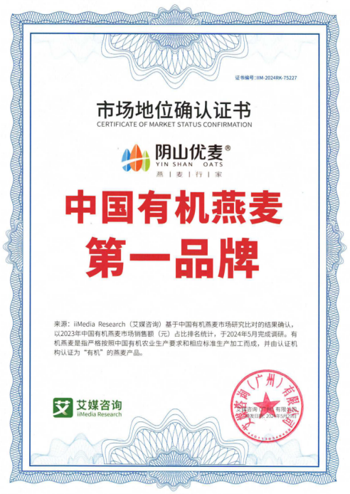 2024年5月,陰山優(yōu)麥獲艾媒咨詢授予的“中國有機燕麥第、一品牌”市場地位認證書,此項認證,是陰山優(yōu)麥品牌發(fā)展史上的一個重要里程碑,標志著陰山優(yōu)麥在有機燕麥行業(yè)取得領(lǐng)導(dǎo)地位。