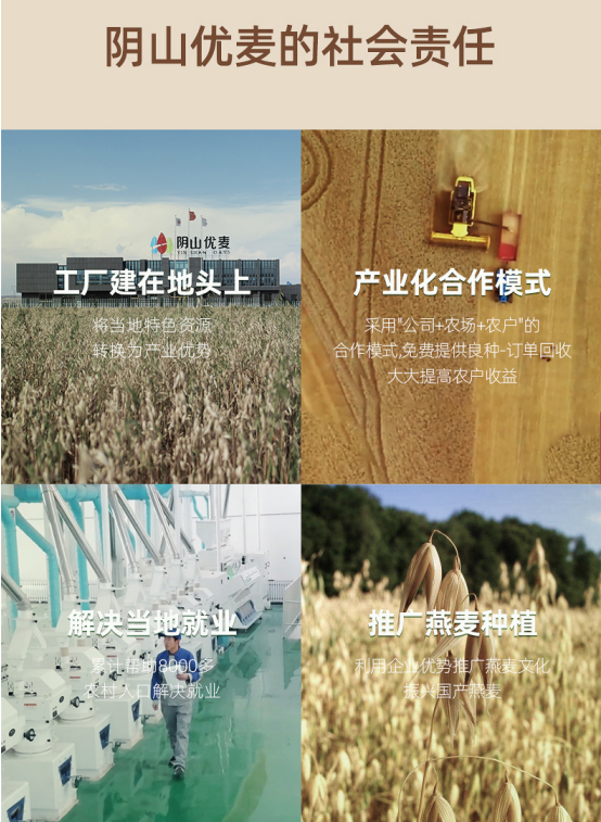 陰山優(yōu)麥在追求企業(yè)發(fā)展的同時,不忘回饋社會,積極參與公益事業(yè),助力鄉(xiāng)村振興。公司通過加強農(nóng)企利益聯(lián)結(jié),把農(nóng)戶納入到燕麥產(chǎn)業(yè)中來,除了加大土地流轉(zhuǎn),讓農(nóng)民取得穩(wěn)定的地租收益,還通過訂單模式,約定燕麥原糧回收保底價格,幫助農(nóng)民解決“賣難”問題。而且,陰山優(yōu)麥每年還為農(nóng)民捐贈燕麥良種、提供技術(shù)培訓(xùn)、增加就業(yè)崗位,幫助農(nóng)民增收致富。在陰山優(yōu)麥的帶動下,當?shù)剞r(nóng)戶對種植燕麥的積極性大幅增加,當?shù)匮帑湻N植面積和原糧價格也逐漸提升,進一步推動了當?shù)匮帑湲a(chǎn)業(yè)邁向規(guī)?;F(xiàn)代化、產(chǎn)業(yè)化發(fā)展的新臺階。
